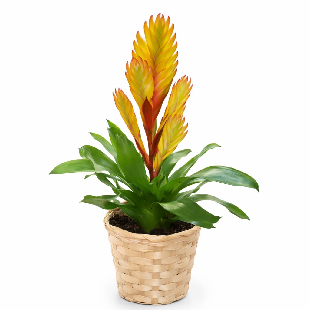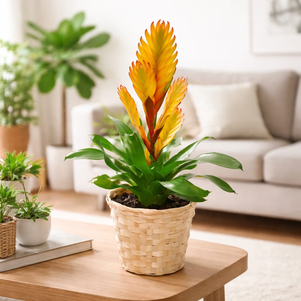 ברומליה מרהיבה בגווני צהוב-כתום חמים, מגיעה בעציץ קלוע טבעי שמעניק מראה אלגנטי ונעים.